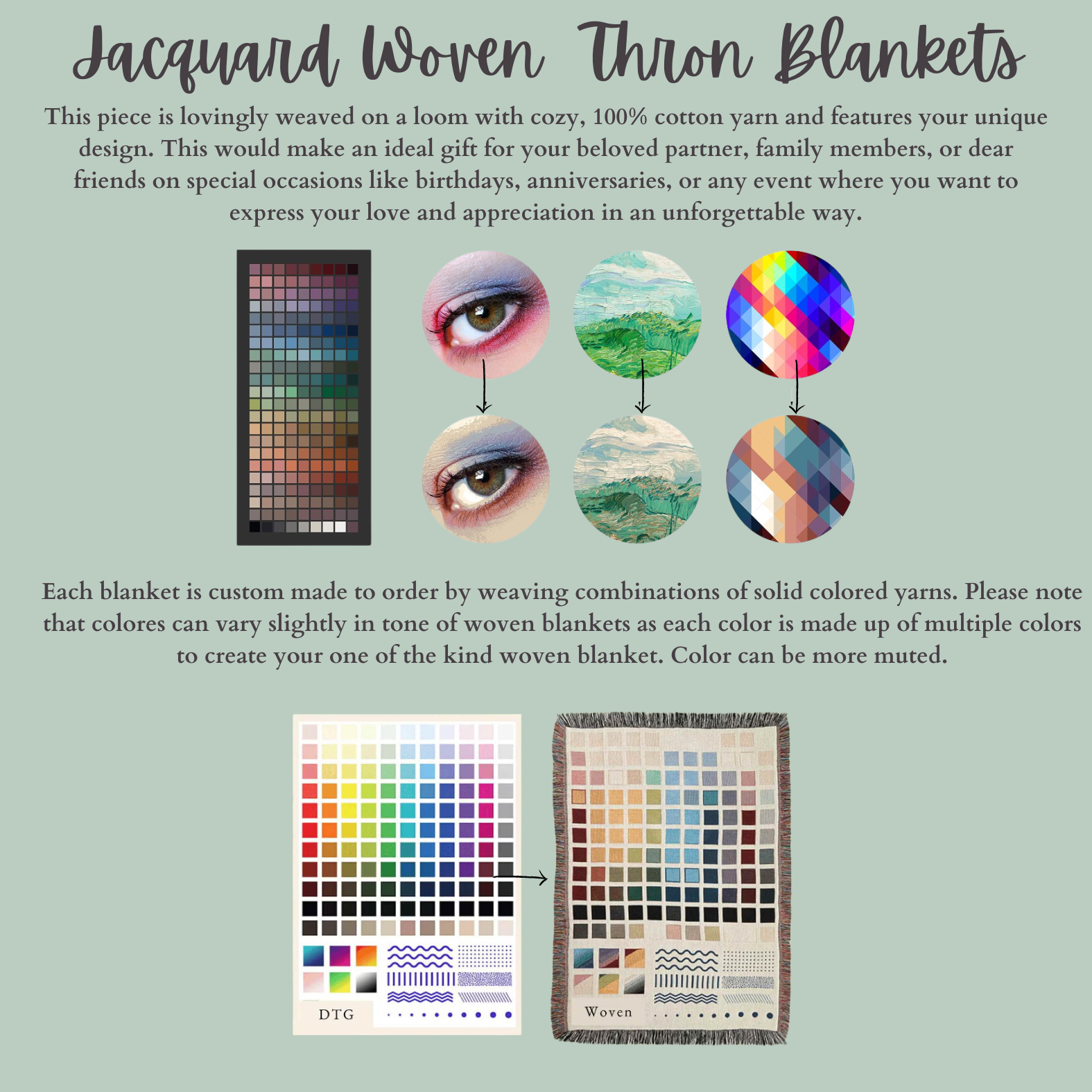 Create a unique keepsake with our Heirloom Woven Blanket. This piece is lovingly weaved on a loom with cozy, 100% cotton yarn and features your unique design. This would make an ideal gift for your beloved partner, family members, or dear friends on special occasions like birthdays, anniversaries, or any event where you want to express your love and appreciation in an unforgettable way.