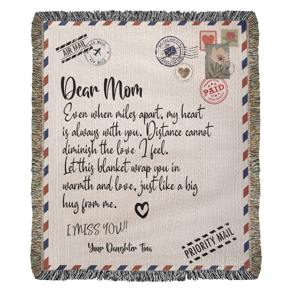 Treat your mom to a timeless treasure with our personalized heirloom woven blanket. Crafted with care and attention to detail, this custom blanket features a beautiful design that can be personalized with your mom's name or a heartfelt message. Perfect for Mother's Day, birthdays, or any special occasion, our woven blanket is not only a thoughtful gift but also a cozy keepsake that she'll cherish for years to come. Made with high-quality materials, this blanket is as durable as it is beautiful, ensuring warmth and comfort with every use. Order now and create a one-of-a-kind gift that celebrates the love and bond between you and your mom.