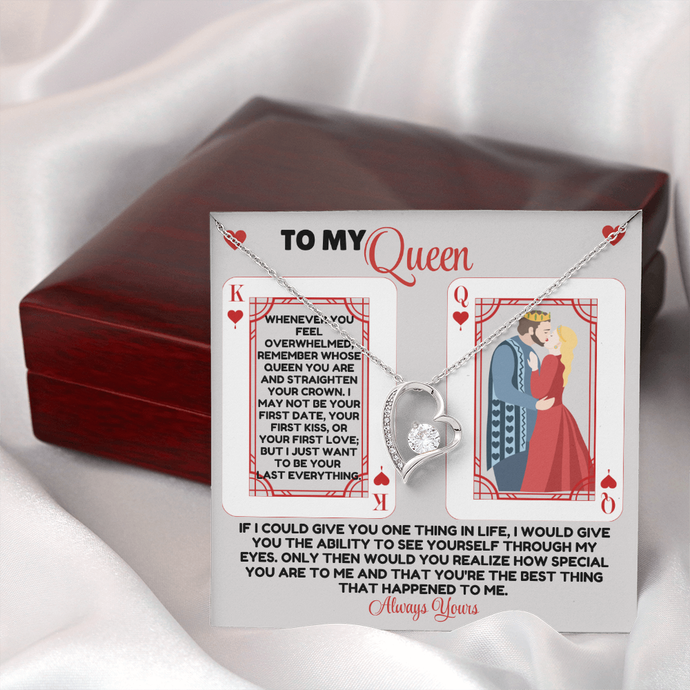 Two-toned box or Mahogany style box with built-in led spotlight that lights upon the necklace and the message card, making it more special.