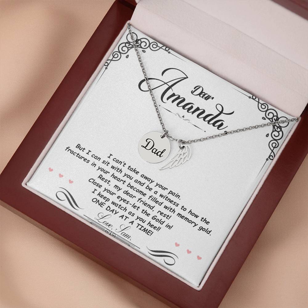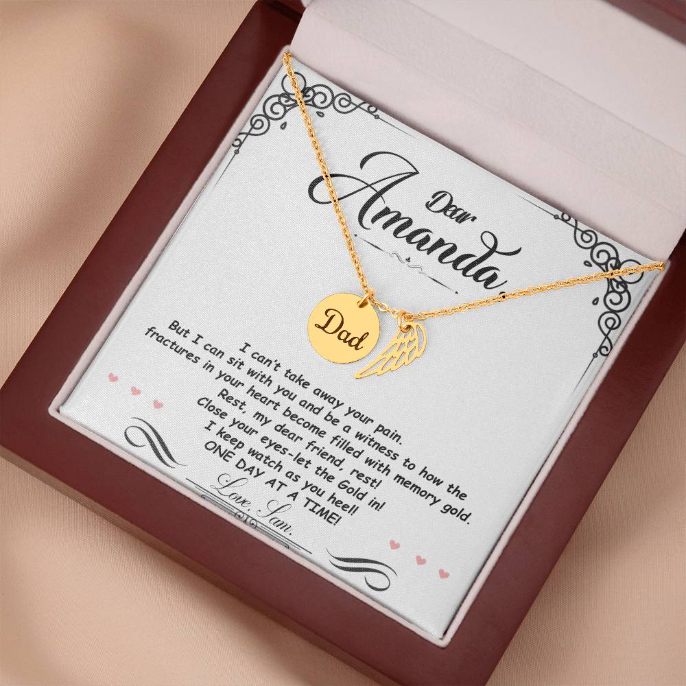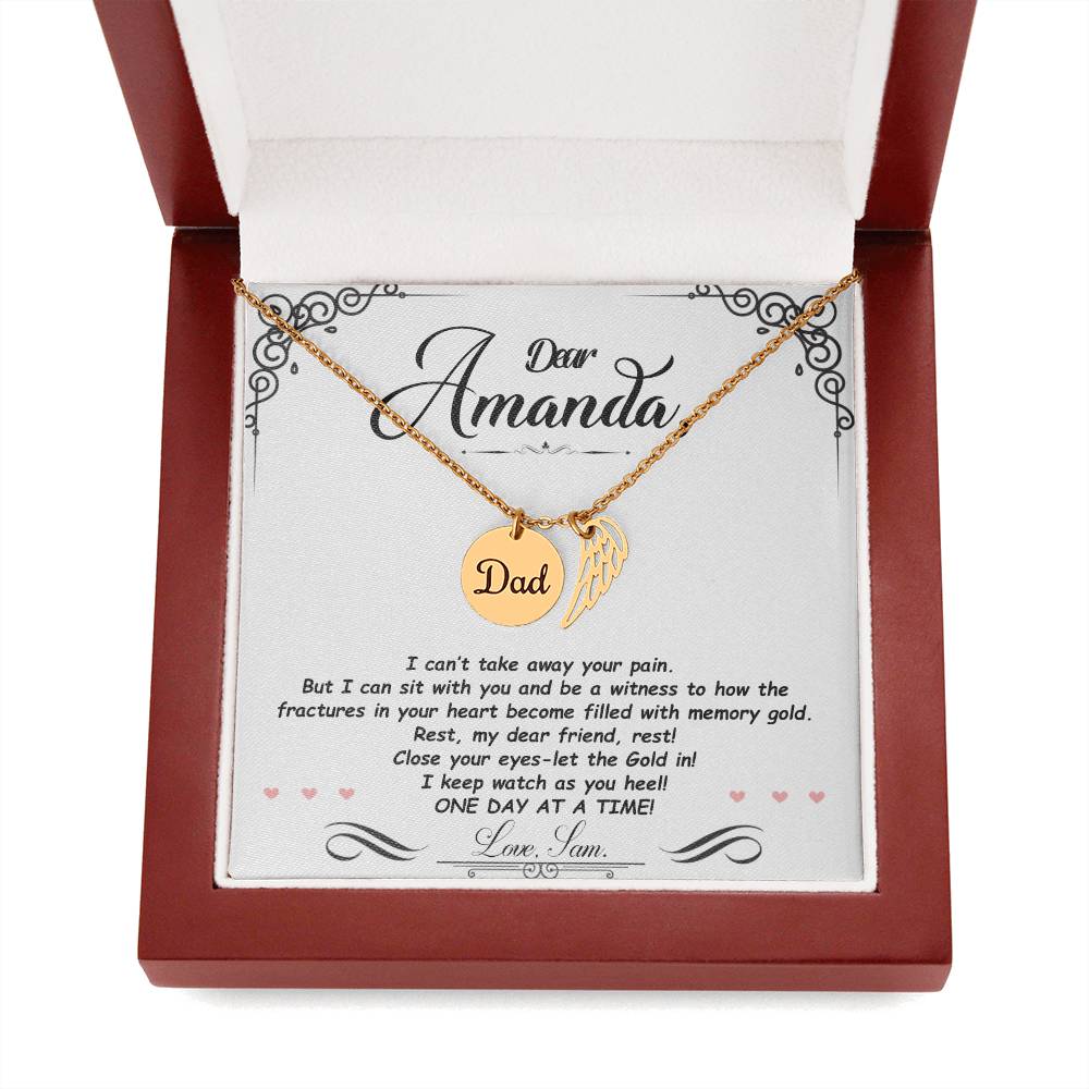 Carry your cherished memories of Dad with you always, thanks to our heartfelt Memorial Necklace. The word "Dad" is elegantly engraved on a delicately hand-polished coin, accented with black enamel for a striking contrast. This coin is beautifully paired with a delicate, polished Angel Wing tag, creating a meaningful and stylish accessory that keeps Dad's spirit close to your heart.