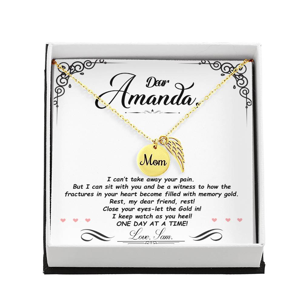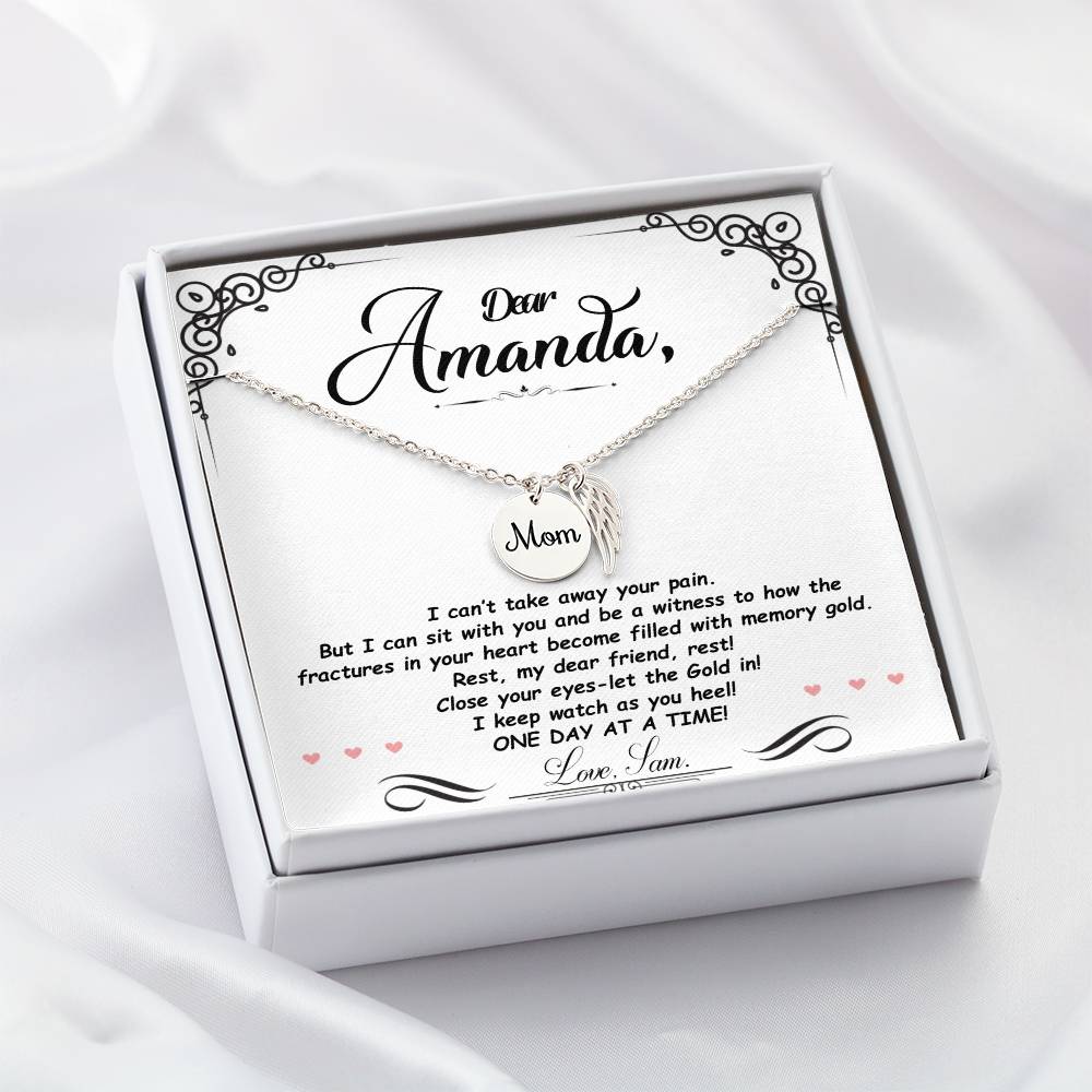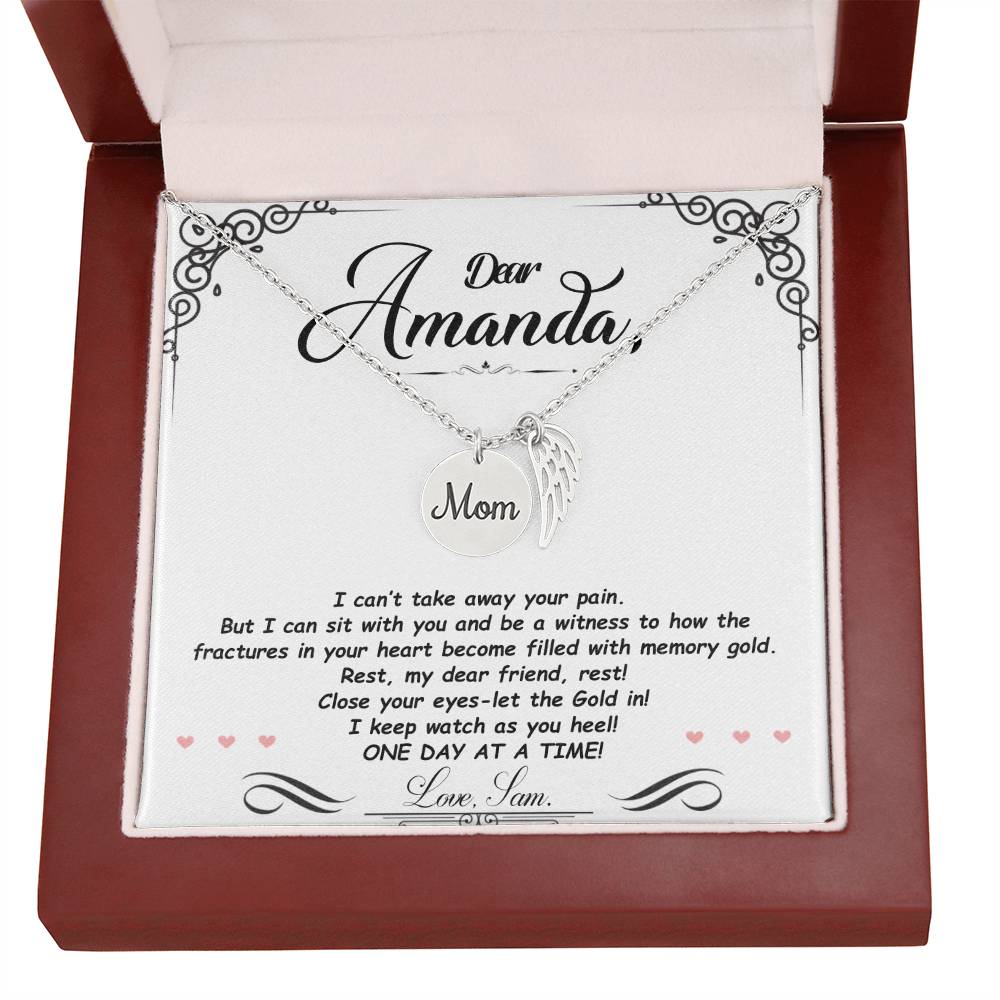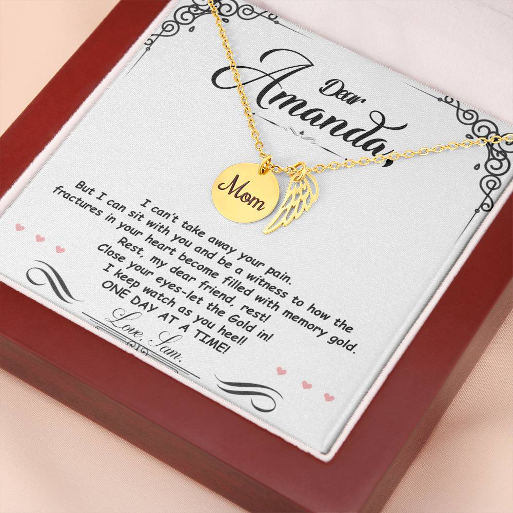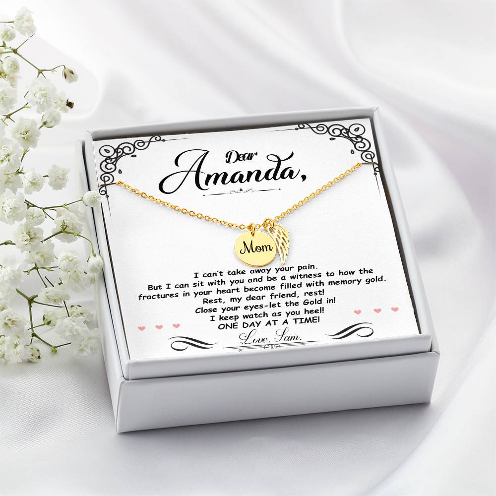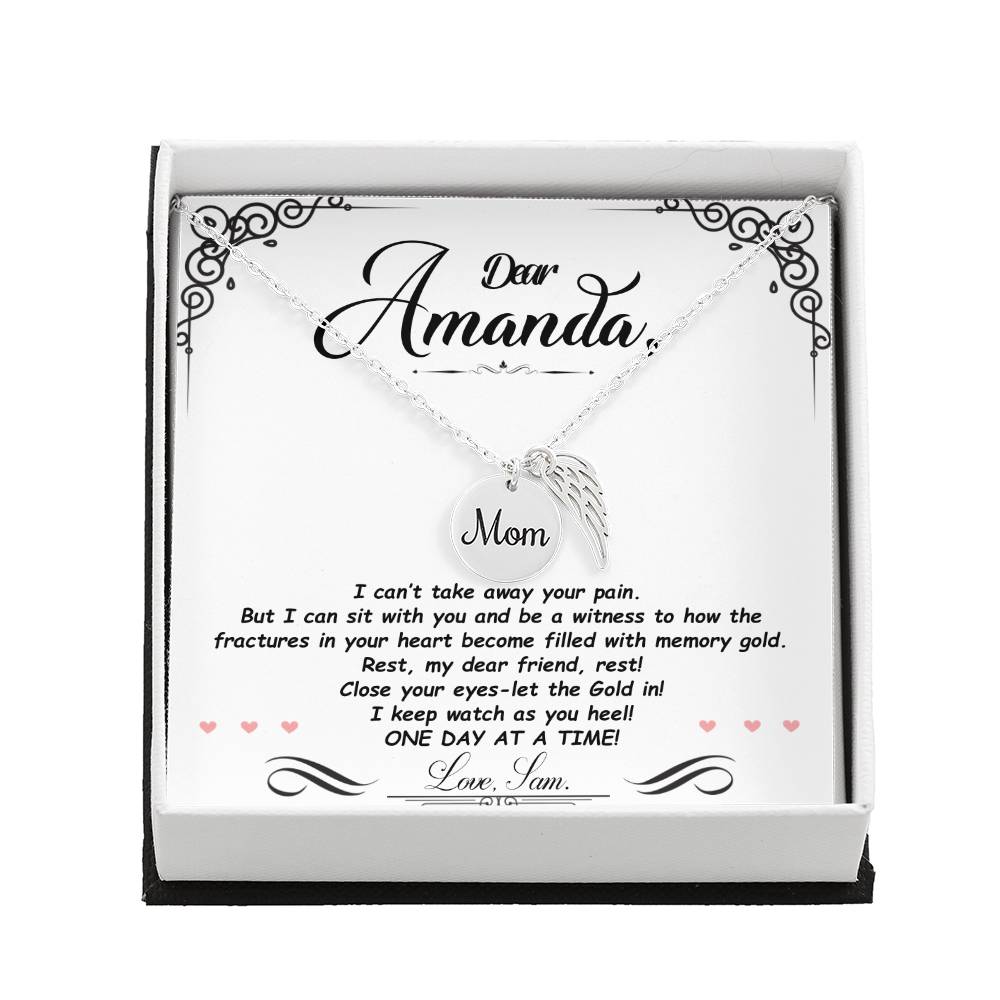 Carry your cherished memories of Mom with you always, thanks to our heartfelt Memorial Necklace. The word "Mom" is elegantly engraved on a delicately hand-polished coin, accented with black enamel for a striking contrast. This coin is beautifully paired with a delicate, polished Angel Wing tag, creating a meaningful and stylish accessory that keeps Mom's spirit close to your heart.